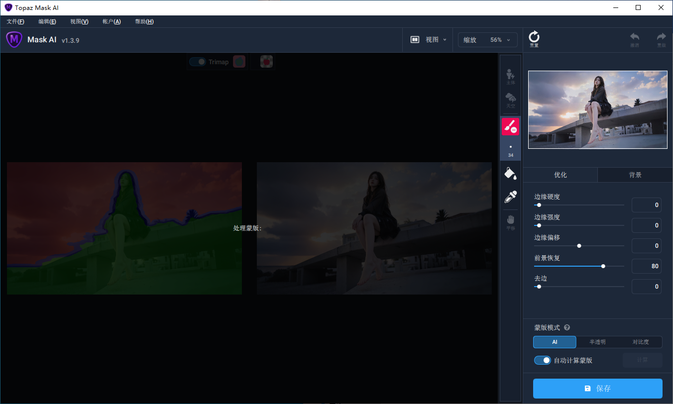 采用了机器学习技术和trimap技术,能够智能识别图像中的对象边界,提供更精确的蒙版效果。